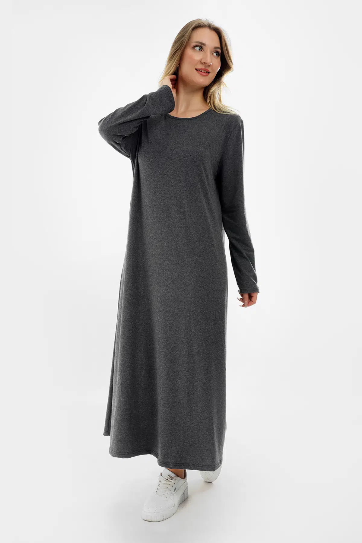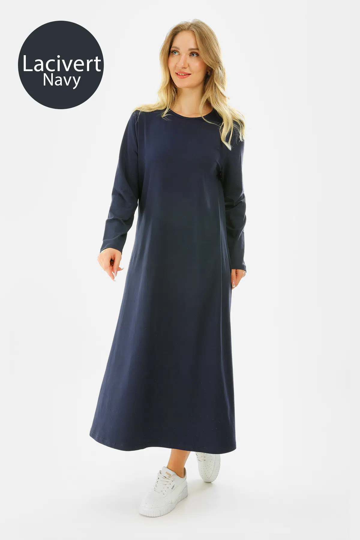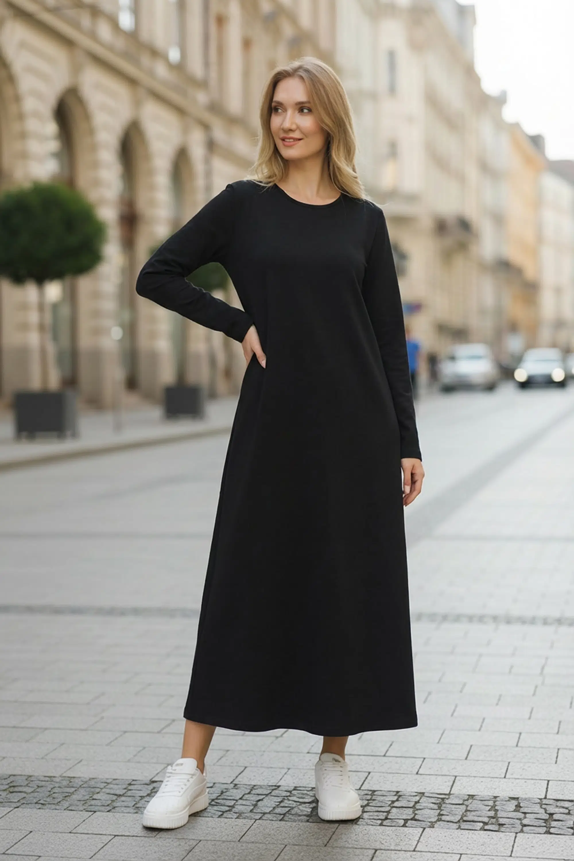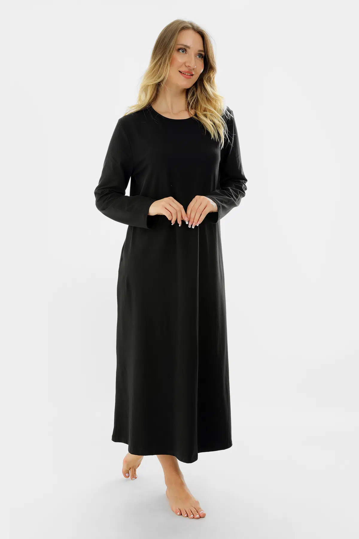 %92 pamuk ve %8 likra karışımı kumaştan üretilen siyah, uzun kollu uzun elbise, günlük kullanım ve ev konforunu bir araya getiriyor.;